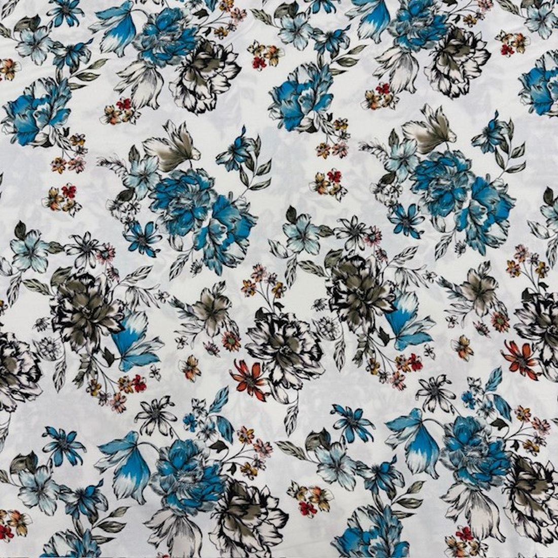 Beyaz Mavi Çiçekli Pamuklu Viskon Kumaş YVZ
